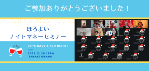 2025.12.20 年末最後のほろよい 27名のご参加ありがとうございました! 文字通り師走で忙しかったのかコンタクトを付けたままリビングにて朝まで床寝すること数日。見事に角膜に傷がつきまして激痛…。充血メガネっ子での … 続きを読む 【開催報告】第31回ほろよいナイトマネーセミナー